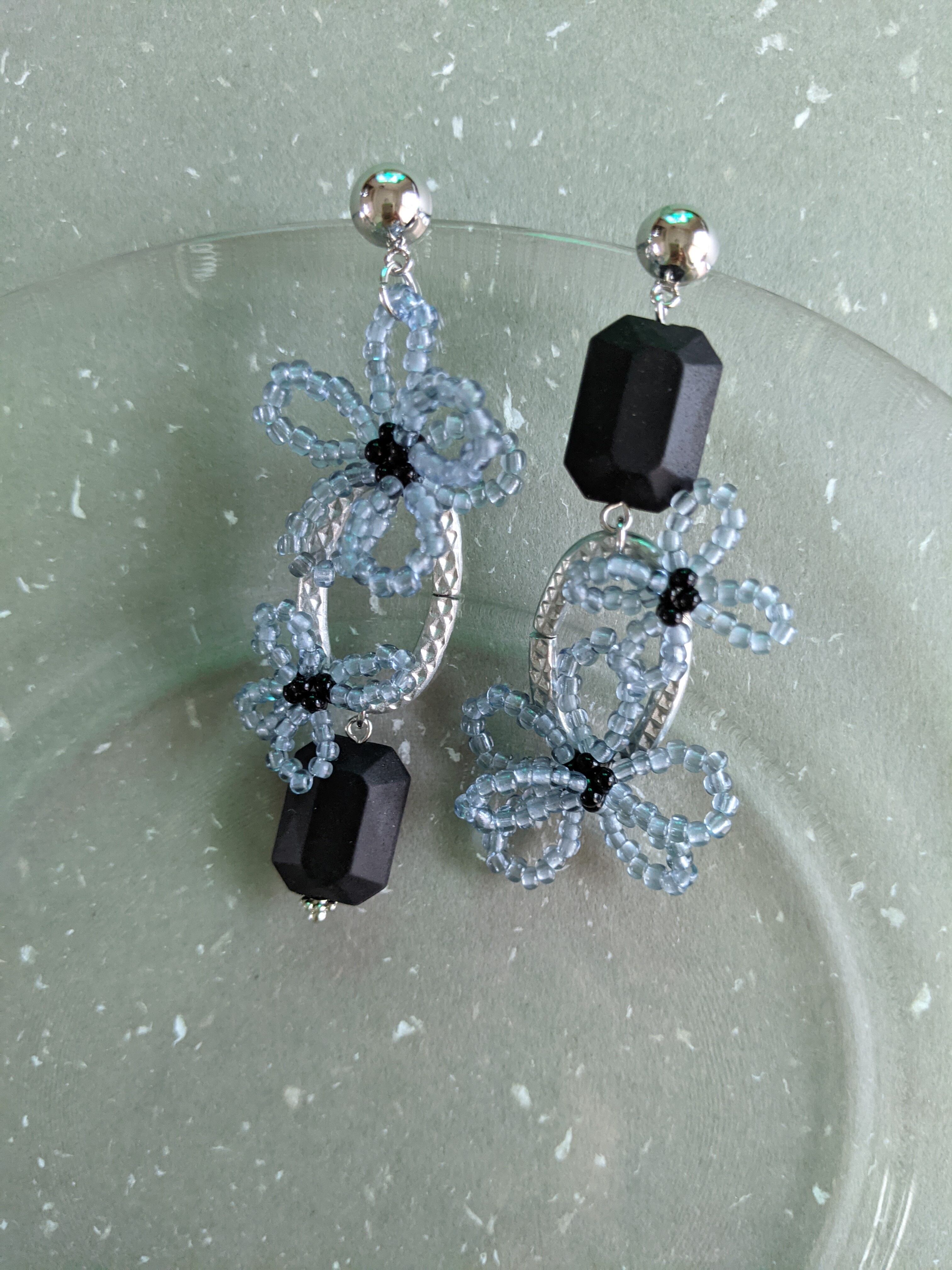 透明感の高いブルーグレーのヴィンテージビーズを使用した、大ぶりな耳飾りです。